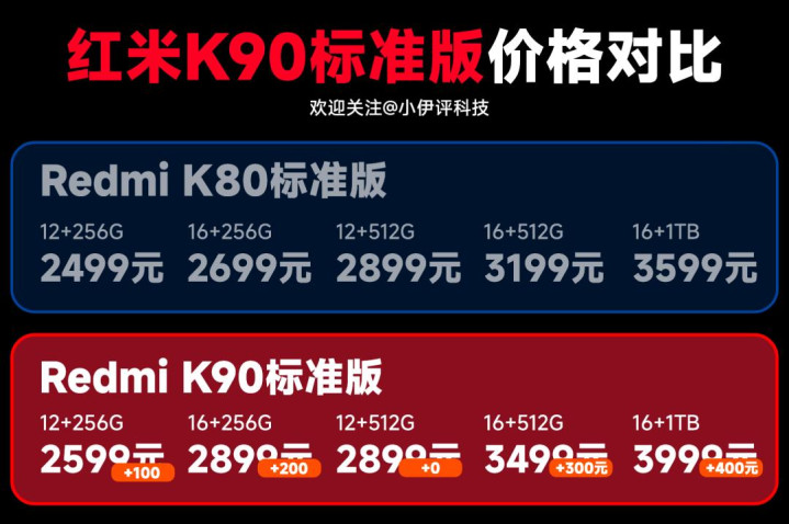 比如红米K90标准版,虽然还是2499元起,但是他最中意的16+512G的价格已经达到了3499元,相比前代硬生生的涨了300元。